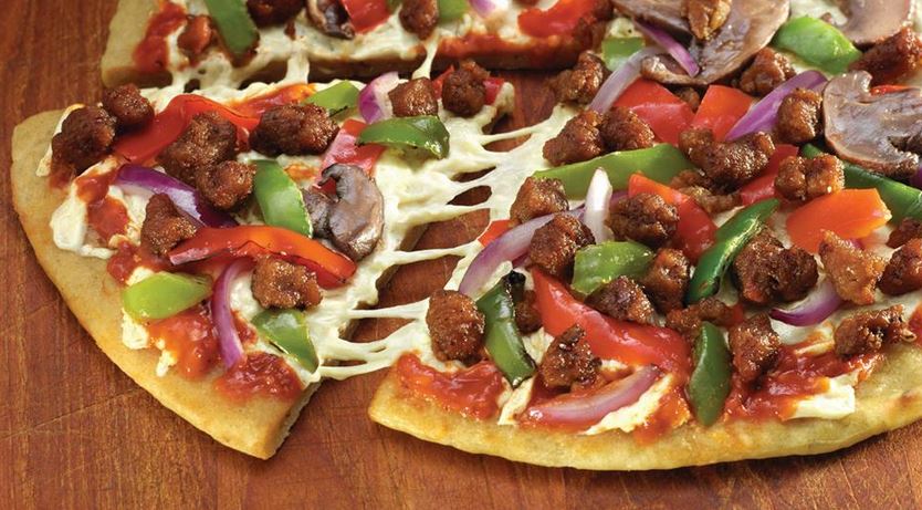 The gluten-free pizzas are topped with Daiya mozzarella cheese, veggies and Beyond Meat sausage crumbles. Daiya sampled the new pie at Expo West.