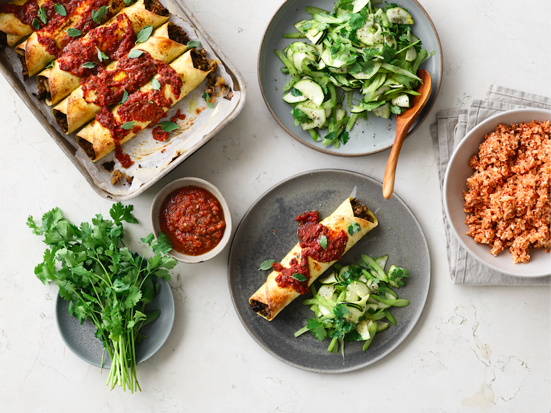 Other sample meals include crispy potato tacos with lime-cilantro slaw, kale-walnut pesto pizza, and layered tikka masala, curried lentils, and rice.