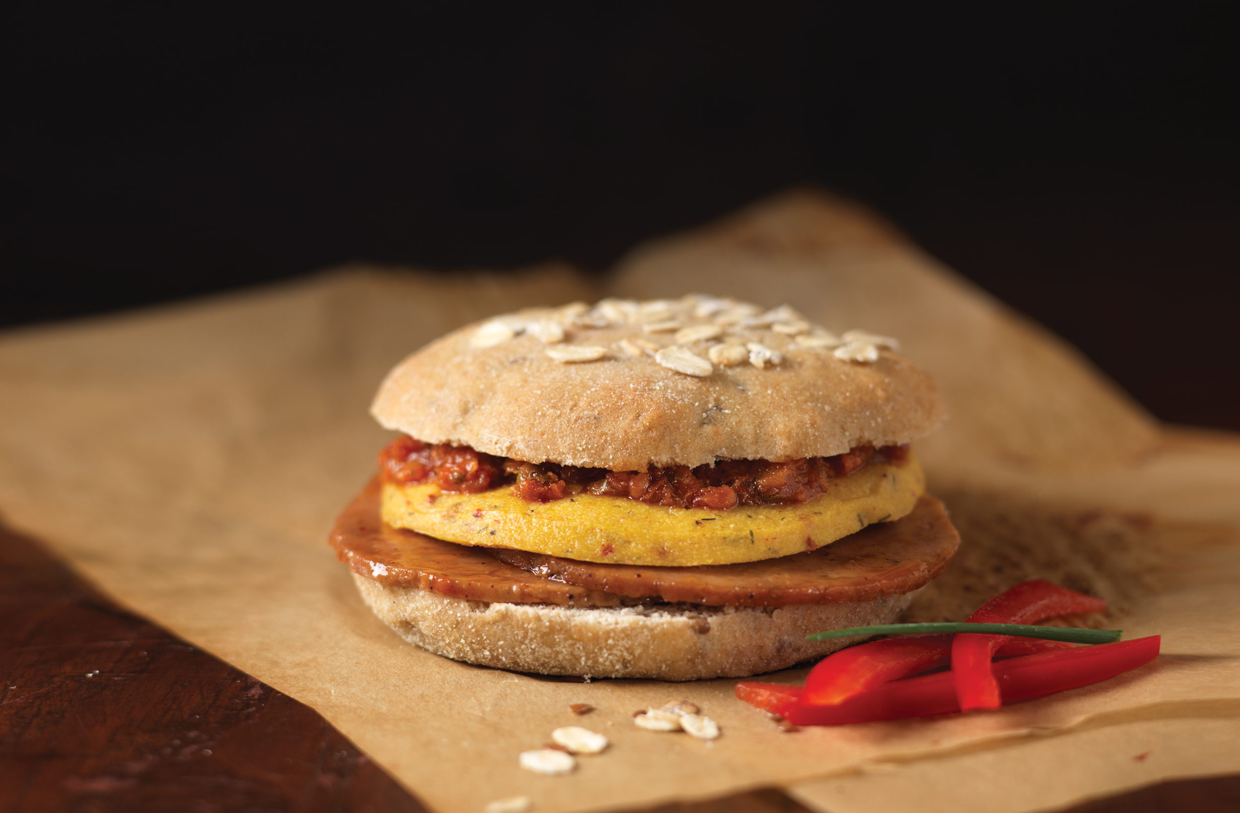 The vegan sammie (officially dubbed the Farmstand Flaxbread™ Vegan Breakfast Sandwich) features the company’s Benevolent Bacon, a spicy chickpea patty (resembling an egg) and a sun-dried tomato spread. The whole wheat bread is made with oats, oat bran, and flaxseed, and has 14.5g of whole grains per serving. The entire sandwich has 14g of protein and 6g of fiber.
